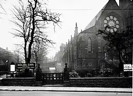 In the Victorian era, Headingley, being at that point a village separate to the busy town of Leeds, became a popular residential area, and therefore by the 1860s had many large stone villas, such as Ashwood Villas close by the church. New amenities were required for the expanding population.[1] The Headingley Hill Church Building Committee was set up on 22 January 1864, with the objective of constructing "an elegant structure" with the capacity for six hundred people.[2] The choice of architect was considered at a meeting one month later; from a list of eight, four were selected – Joseph James of London, J P Pritchett of Darlington, and William Hill and Cuthbert Brodrick of Leeds.[3][note 1] An architectural competition was initiated, being a popular method of getting the best design from a surplus of architects, with each of the four invited to submit.[4]