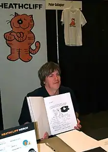 Heathcliff is an American comic strip created by George Gately in 1973,[1] featuring the title character, an orange cat. Now written and drawn by Gately's nephew, Peter Gallagher, it is distributed to over 1,000 newspapers by Creators Syndicate, which took over the comic from McNaught Syndicate in 1988.[2][3]