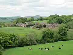 The village of Heaton, seen from the south. The peak in the distance is Shutlingsloe.