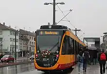 Because of delayed approval for the use of EEO for the ET 2010 (part of the Bombardier Flexity Swift family) vehicles, the section between Kaufland and Neckarsulm was temporarily dedicated as a BOStrab line.[7] On 4 November 2013 the first test run took place on this section.[8] Until the reclassification of the northern section of the line as an EEO route and its connection to the DB network in December 2014, Stadtbahn services could only operate as far as Neckarsulm. The operation of trains through to Sinsheim was delayed until 1 May 2015 by the renovation of a bridge in Bad Wimpfen.[9]