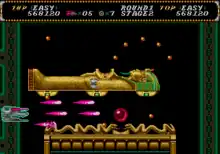 Uemura and members of the team struggled with various aspects of designing a horizontal shoot 'em up title that proved to be frustrating for them like the terrain and collision detection, as their previous experience with vertical shoot 'em up did not carried over a horizontal format.[9][10][11][12] Artist Kōetsu Iwabuchi, who previously worked on Twin Cobra, was responsible for the artwork, stating in a 1990 interview with Gamest that he had no limitation when creating the designs.[13] Uemura also requested for the project to have a puzzle element to be integrated.[9][11] Both the single-player and co-op versions were also created from the beginning of development due to pressure to make two-player games at the time.[12] Despite the difficulties and changes during the creation process, the team managed to finish the project.[12]