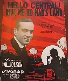 '"Hello Central! Give Me No Man's Land" is a World War I era song released in 1918. Lyrics were written by Sam M. Lewis and Joe Young. Jean Schwartz composed the music. The song was published by Waterson Berlin & Snyder, Co. of New York City.[1] Artist Albert Wilfred Barbelle designed the sheet music cover, which features a photo of Al Jolson next to a shadow of a child on the phone. Explosions in No Man's Land take up the rest of the red background.[2] The song was written for both voice and piano.[3][4] It was first introduced in the 1918 musical Sinbad.[5]