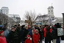 Protests at Austurvöllur, 17 January 2009, including a placard (centre) reading Helvítis fokking fokk!!