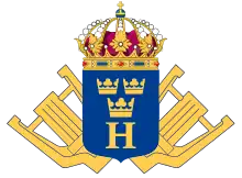 Uniform m/1987 is the general uniform of the Home Guard.[4] Some personnel uniforms also have a civilian design with a different name and uniform in parallel with their military function. The Uniform 90 is also worn on certain occasions. Uniforms are regulated by the Armed Forces regulations of 2015.[8] A distinction for the uniforms of Home Guard musicians are the red shoulder flap sleeves along with the shoulder ornament.[9]