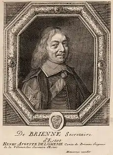 Henri-Auguste de Loménie (1594 – 3 November 1666), Count of Brienne, Seigneur de La Ville-aux-Clercs was a French politician. He was secretary of state for the navy from 1615 to February 1643, and then secretary of state for foreign affairs from 1643 to 1663 under Mazarin during the minority of Louis XIV. From the Loménie family (originating in Flavignac in Limousin), he was the son of Antoine de Loménie, secretary of state to Henry IV and a Huguenot convert.