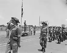 Major General Chambers, GOC 26th Indian Division, takes the salute at the victory parade in Rangoon.