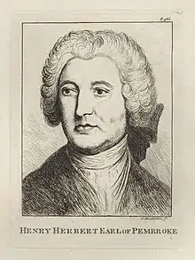 Lt.-Gen. Henry Herbert, 9th Earl of Pembroke, 6th Earl of Montgomery PC FRS (29 January 1693[1] – 9 January 1749[2]) was an English peer and courtier. He was the heir and eldest son of Thomas Herbert, 8th Earl of Pembroke and his first wife Margaret Sawyer. He was styled Lord Herbert from birth until he inherited his father's earldoms of Pembroke and Montgomery in 1733. He also became Lord of the bedchamber to King George II of the House of Hanover.