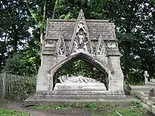 As this appeal closed, another opened to raise money for a monument.[110] In February 1857, after deciding that the best location was over Raikes’s grave, the committee asked a local architect, Thomas Penson, to design a structure that was solid, imposing, and ecclesiastical.[111][112][113]