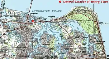 Henry Town, Henry Towne, or Henries Towne was an early English colonial settlement near Cape Henry, the southern point and gateway to the Chesapeake Bay in the Colony and Dominion of Virginia, now in modern Virginia Beach, Virginia, on the East Coast of the United States. Archaeologist Floyd Painter of the Norfolk Museum of Arts and Sciences (now the Chrysler Museum of Art) originally excavated the site in 1955, but it was only conclusively determined to be Henry Town in 2007 by United States Army scientists reviewing the site's artifacts, and no primary source documents exist (save those supposedly held by one now-deceased archaeologist). It was located east of Norfolk, Virginia and north of Chesapeake and south of the Hampton Roads harbor at approximately 36°54′30″N 76°7′20″W / 36.90833°N 76.12222°W. The historical and archeological site is immediately north of U.S. Route 60 (Shore Drive) on what is now Lake Joyce, formerly an inlet connecting with Pleasure House Creek, a western branch of the Lynnhaven River, itself an estuary of the Chesapeake Bay and Hampton Roads.