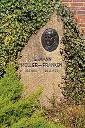 After resigning as chancellor, Müller retired from public life. Following the elections in September 1930, which saw massive gains for Adolf Hitler's NSDAP, Müller called on his party to support Heinrich Brüning's government even without being part of the coalition.[2] His death in 1931 following a gallbladder operation[3] was seen as a major blow to the Social Democrats. He died in Berlin and is buried there at the Zentralfriedhof Friedrichsfelde.