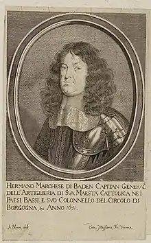 Margrave (Prince) Hermann of Baden-Baden (12 October 1628 in Baden-Baden; died 30 October 1691 in Regensburg) was a general and diplomat in the imperial service. He was Field Marshal, president of the Hofkriegsrat, and the representative of the Emperor in the Perpetual Diet of Regensburg.
