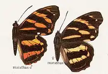 - H. m. marathus Doubleday Wingspan 70–90 mm. Above bands tawny, very wide and confluent. It lives from Sikkim to eastwards.