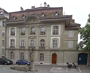 The house was created, from 1690, by a member of the de Büren family. This was achieved by amalgamating various neighbouring properties and it is from this period that some of the interiors remain. These interiors with delicate geometric panelling and plasterwork are considered to be some of the finest of the period in Bern.[3] One of the more eminent members of this family and a resident of the house was Philippe Albert de Büren (1678–1756), a member of the Grand Council of Bern from 1710 and Governor of Morges from 1723; he employed the architect Paul Hofer to carry out further building work during the 1730s.[3]