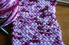 A knitted herringbone stitch creates a firm fabric "similar to a woven in appearance and elasticity".[1] A heavyweight fabric can be made with variations of the herringbone stitch, such as the herringbone twist stitch, which can be worked in either one or two colours; both versions are suitable for experienced knitters.[2]