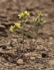 Hesperolinon breweri is a rare species of flowering plant in the flax family known by the common names Brewer's dwarf flax and Brewer's western flax. It is endemic to California, where it is known from three counties in the San Francisco Bay Area. It is found in chaparral ecosystems, often on serpentine soils. This is an annual herb growing erect to a maximum height near centimeters. Its narrow, linear leaves are greenish to purplish in color. It produces dense inflorescences of flowers with glandular sepals and five bright yellow petals. The protruding stamens hold large orange-yellow anthers. This uncommon California endemic is threatened by development of its habitat but its current status is not known.