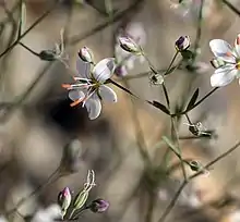 This is an annual herb producing an erect stem up to 30 centimeters tall, somewhat thick and tough at the base. The glandular leaves are linear in shape and are alternately arranged along the stem. The inflorescence is a wide open cyme of flowers, each flower with glandular sepals and pink-veined white petals about half a centimeter long. The protruding stamens are tipped with pink anthers. It flowers from April to July.[3]