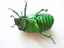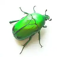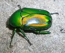 Heterorhina elegans is a species of Scarab beetle found in India and Sri Lanka that belongs to the flower chafer subfamily. Its genus name is frequently misspelled as "Heterorrhina".[2] The adults are about 2 to 3 cm long and are usually bright glassy green appearing reddish at some angles. The clypeus is narrow and there is a ridge along the middle. They are seen in aggregations made up of large numbers in southern India during June to October.