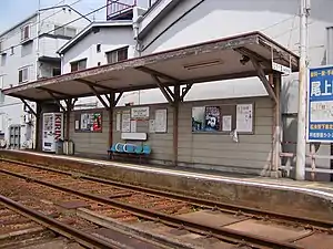 A side platform is located on each track, before passing the tramway crossing (Seimei-dōri).