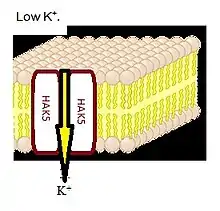 A cell membrane consists of many transport proteins that allow for ion transport, as ions can not simply pass through the gradient due to their charge.[15] High Affinity K+ transporter HAK5, is important for the regulation of K+ ions within the cell. When there is a lack of K+, the HAK5 transporter is activated to uptake K+. This occurs when there is high salinity within the soil, which often happens within the crop industry.[16] If the soil has a high salinity content, this means Na+ from NaCl competes with K+ for uptake because they are similar ions and use the same transporters. However, K+ accounts for the activation of over 50 enzymes, which Na+ cannot be a substitute.[17] With HAK5 transporters, this competition is lowered, as there is a specific transporter for K+ that insures its uptake. The transporter for K+ ensures that the K+ and Na+ maintain homeostasis in the plant. K+ is required for environmental changes like putting the plant into a higher salinity situation.[18] K+ ensures plants are able to adapt to these changes. The only way in which they are able to obtain this K+ whilst in high salinity conditions is through HAK5 transporters regulating the amount because it is only turned on when there is a low concentration of K+ in the soil.[18]