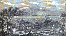 Diana Spring and Magnesia Spring rose in cemented basins a few yards apart at the base of a small bank 50 or 60 yards (46 or 55 m) northward and nearer the creek. Water from Diana supplied a small bathing plunge near by, whereas Magnesia was used only for drinking.[5] The recorded temperatures of these springs were 80 °F (27 °C) and 68 °F (20 °C), and their flows were, respectively, about 4 US gallons (15 L; 3.3 imp gal) and 1⁄4 US gallon (0.95 L; 0.21 imp gal) per minute.[8]