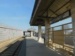 ![]() The Highland Lake/Lewisville Village station in February 2017. A milepost sign for Interstate 35E is present on the left. | |||||||||||