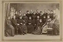 With a group of other Finnish teachers, 1891. Käkikoski is sitting on a table at the far right; her partner Fanny Pajula is standing, 4th from left.