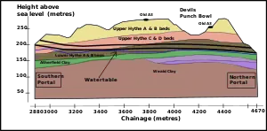 Most of the tunnel passes through the Upper Hythe C and D layers and the Lower Hythe A layer, which are described as "Weak, locally very weak to moderately strong, slightly clayey fine-to-medium sandstone with occasional thin beds of clayey/silty fine sand" and typically has Uniaxial Compressive Strength (UCS) values of 2–5 MPa. The rock is heavily fractured and has mean fracture centres varying from 190 to 815 mm (7.5 to 32.1 inches). The southern end of the tunnel however passes through the "less competent" Upper Hythe A and B layers which are described as "medium-dense thinly bedded and thinly laminated, clean-to-silty and clayey fine and medium sand with subordinate weak-to-strong sandstone, cherty sandstone and chert".[14] Most of the tunnel is above the predicted water table.
