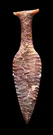 The Hindsgavl Dagger was made of flint in around 1900–1800 BC.[2] It is 29.5 cm (11.6 in) long and has a blade thickness of less than 1 cm (0.39 in). It is an example of a so-called fishtail dagger, named for the shape of the handle. The design was inspired by imported bronze daggers, which had already started to appear on the Scandinavian market. Production of flint daggers continued well into the Nordic Bronze Age.[3]