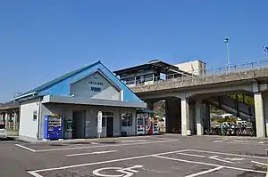 The station consists of a side platform serving a single elevated track. The station building, which has been built at the base of the elevated structure, is unstaffed and serves only as a waiting room. Access to the platform is by means of a flight of steps and an elevator. An enclosed shelter is provided on the platform for waiting passengers. Parking for cars is available at the station forecourt.[2][5]
