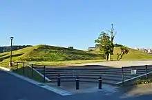 The Hiruiōzuka Kofun is a zenpō-kōen-fun (前方後円墳), which is shaped like a keyhole, having one square end and one circular end, when viewed from above. It is the largest keyhole-shaped tumuli in Gifu Prefecture and dates from the mid-4th century. It is located on the Makino plateau at an elevation of 25 meters. [2]