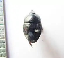 The Body length of both sexes is about 4.1 to 6.7 mm. The body is oval, and strongly convex and black in color. Their vertex is feebly depressed in the middle. The Prosternal Lobe is rounded at the apex, with complete marginal stria. The Prosternal keel is even, without carinal stria.[4] First to 4th dorsal elytral striae and pronotal marginal stria both are complete. The beetles Propygidium is feebly depressed on each lateral side, and shiny. Propygidium irregularities cover its body. Pygidium convex medially, deeply and coarsely punctate. The Protibia consists of 2 or 3 denticles on the outer margin.[5] Striation of the Elytrae is highly variable according to the geographical distribution. Anterior margin of the pronotum is deeply bisinuate.[6]