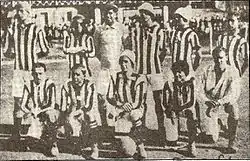 Atlético won the state league in 1931 and 1932, before becoming a professional club in 1933.[13] After another Campeonato Mineiro triumph in 1936, Atlético won its first title at national level in 1937. This was the 1937 Copa dos Campeões Estaduais, which was organised by the Federação Brasileira de Foot-Ball, the federation for professional clubs that would later merge into the Brazilian Sports Confederation (CBD). The competition was contested by the 1936 state league champions from Minas Gerais (Atlético), Rio de Janeiro (Fluminense), São Paulo (Portuguesa) and Espírito Santo (Rio Branco). Atlético defeated the latter 5–1 in the final match, played at the Antônio Carlos stadium. The main responsibles for the achievement were Zezé Procópio, goalkeeper Kafunga and Guará.[14] The title was followed by two more Campeonato Mineiro victories, in 1938 and 1939.[15]
