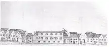 The Dutch tried several times unsuccessfully to take urban planning measures, in particular to widen the streets in order to better counter the constant threat of fires. Documented is, for example, such an attempt from 1837, when a fire had destroyed 90 houses. The opportunity seemed favorable to cut new roads through the city and the Dutch had the planned routes staked out with bamboo sticks. Certain Elmina women, removed the marking sticks with inflammatory warning signs. The Dutch then imprisoned the king and some elders as a result. This measure and the attempt to send 32 recruits into the city with rams to tear down the foundations of the burnt houses on the future route resulted in failure and the new roads were not built.[37] In the 18th century, the city began to expand to the northern peninsula, where the Coenraadsburg is located. As early as the 17th century, a drawbridge had been built over the lagoon, which encouraged gradual settlement and provided access to the West India Company gardens below Conraadsburg. The drawbridge was equipped with guard houses at both ends to deny foreign Africans access to the city.[38] For the first half of the 18th century, Feinberg estimated the population of Elmina at about 12,000–16,000 people.[39]