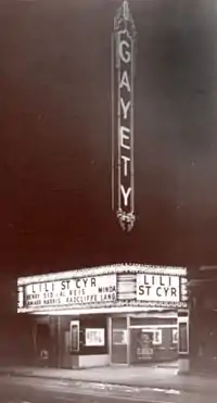 French greats Charles Aznavour,[8] Tino Rossi and Charles Trenet performed at the Au Faisan Doré cabaret, and Édith Piaf and Patachou at the Cabaret Sans souci. Frank Sinatra, Dean Martin, Jerry Lewis and Sammy Davis Jr performed at Cabaret Chez Paree. Great shows by strippers such as Lili St-Cyr, Peaches and Gypsy Rose Lee could be seen at Gaiety Theatre and Cabaret Roxy.[9][6] Even French singer Mistinguett, at the age of 80, made a bold presence at Cabaret Montmartre in 1955.[9]