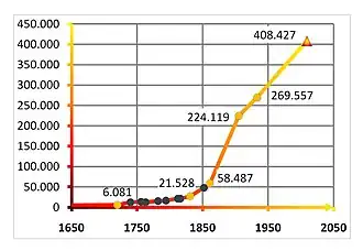 In 1721, a French commune was founded in the city for the Huguenots.[8] The French were subject to separate French law and had a separate French court, which existed until 1809.[8] In the following years, large groups of Huguenots settled in the city, bringing new developments into the city crafts and factories. The French greatly contributed to the city's economic revival, and were treated with reluctance by the German burghers and city authorities.[9] The population increased from 6000 in 1720 to 21,000 in 1816, and 58,000 in 1861.