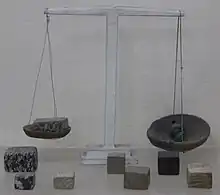 Depiction of equal arm balances is found in the art of Ajanta cave (No. 17) in the Maharashtra state.[15] Beams of steelyard balances have been unearthed from the 8th century CE archaeological sites at Sirpur and Arang.[15] The research conducted by Abū Rayḥān Muḥammad ibn Aḥmad al-Bīrūn, an Islamic scholar who undertook one of the first studies of India's traditions in his Tahriq-e-Hind, also reflect on the regular usage of the steelyard in India.[16]