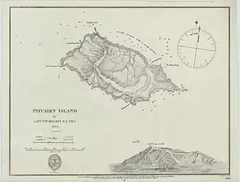 The islands were uninhabited when they were rediscovered by the Portuguese explorer Pedro Fernandes de Queirós, working in the employ of Spain, in January 1606.[2] The British rediscovered the island on 3 July 1767 on a voyage led by Captain Philip Carteret, and named it after the fifteen-year-old Robert Pitcairn (a son of the soldier John Pitcairn) who was the crew member who first spotted the island; he was lost at sea three years later. Carteret, who sailed without the newly-invented marine chronometer, charted the island at 25°02′S 133°21′W / 25.033°S 133.350°W, and although the latitude was reasonably accurate, his recorded longitude was incorrect by about 3° (330 km [210 mi]) west of the island.[3][4] When the Bounty mutineers arrived on Pitcairn, it was uninhabited; however, a large number of archaeological items remained, such as marae, tiki carvings, adzes and adze flakes, rock carvings and petroglyphs.[1]