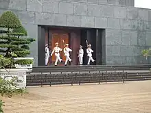 Construction work began on September 2, 1973, and the mausoleum was formally inaugurated on August 29, 1975.[4] It was inspired by Lenin's Mausoleum in Moscow but incorporates distinct Vietnamese architectural elements, such as the sloping roof. The exterior is made of grey granite, while the interior is grey, black and red polished stone. The mausoleum's portico has the words "Chủ tịch Hồ-Chí-Minh" (President Ho Chi Minh) inscribed across it. The banner beside says "Nước Cộng Hòa Xã Hội Chủ Nghĩa Việt Nam Muôn Năm" (en: "Long live The Socialist Republic of Vietnam").
