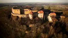 Hohenrechberg Castle (German: Burg Hohenrechberg) is a ruined castle in Schwäbisch Gmünd in Baden-Württemberg, Germany. It was built as a spur castle on the spur (called "Schlossberg") of the Hohenrechberg mountain, which forms together with the Hohenstaufen Mountain and Stuifen the Three Emperors Mountains, just a few kilometers next to the family seat Hohenstaufen castle of the Staufer dynasty.