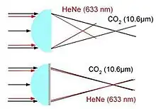 Holo/Or's Dual Wavelength lens was the first commercial DOE in the world. These lenses correct the strong chromatic and spherical aberrations between a CO2 laser and its red aiming, and unite both beams to a single diffraction-limited focal point beam, by the use of a diffractive surface pattern. This product continues to be used in surgical laser systems and FTIR systems.