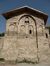 The Holy Forty Martyrs Church, an elongated six-columned basilica, has three semicircular apses and a narrow narthex from the west. Another building was added later to the west side of the church. The church interior was covered with mural painting probably in 1230. On the western addition some of the outer decoration survived revealing the traditional arches and coloured small ceramic plates inserted into the wall. It is not clear if the church has frescoes painted on the outer walls.
