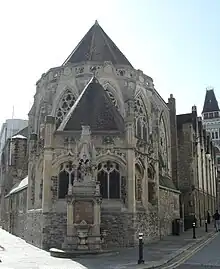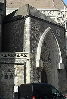 A major alteration came in 1892, when a polygonal vestry was built beyond the chancel.[11][13] Next to it, on the south side, space above the porch was intended to hold a tower and spire, but because the church cost so much to build neither feature was ever added.[8][13][14] Between 1889 and 1890, the chancel arch was given intricate carved decoration by sculptor Thomas Earp, and a craftsman from Ghent provided an ornate rood screen.[15] W. H. Romaine-Walker designed an "exceptional"[8] alabaster and marble pulpit with a double staircase around the same time.[16] He had also been responsible for the vestry and other general refitting in the church. London architect Henry Ward, who moved to Hastings and carried out most of his work in the town, was responsible for an unusual miniature Lady chapel (formed out of the base of the organ chamber) and some work on the doors and windows at the start of the 20th century.[10][15][17][18] Later in the century, master calligrapher Edward Johnston provided a high-quality illuminated vellum-covered missal.[19]
