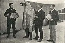 Surviving sources testify to the fact that while there was some variation in the hoodening tradition as it was practised by various people in different parts of East Kent, it was nevertheless "on the whole remarkably uniform".[2] The hooden horse, which was at the centre of the tradition, was usually made out of a wooden horse's head affixed to a pole about four feet long, with a hinged jaw that was moved by a string.[2] This horse was then carried aloft by a person concealed beneath a dark cloth.[3] As part of the hoodening custom, a team of "hoodeners", consisting of between four and eight men, would carry the horse through the streets. This team included the horse operator, a "Groom", "Driver", or "Waggoner" who carried a whip and led the horse by a bridle, a "Jockey" who would attempt to mount the horse, a "Mollie" who was a man dressed as a woman, and one or two musicians.[2] All of the men were farm labourers, usually being those who worked with horses.[4]