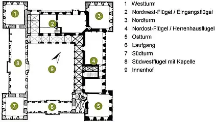 In contrast to older publications, excavations in the 1990s showed that Horst Castle is not a pile foundation, but rests only on several layers of roughly hewn sandstone. This inadequate foundation is the main reason why only a few parts of the once-large complex remain in their original state today. These include the cellars with cross vaults of all four castle wings - with the exception of the cellar floors of the west and east towers - as well as the entrance wing in the north-west and the so-called Knights' Hall with Renaissance cross-storey windows in the rebuilt north-east wing. The north tower connecting the two wings was rebuilt in the 1990s with the dimensions of its predecessor and its simple sandstone cornice echoes the horizontal structure of the two adjoining wings. All the other corner towers of the castle complex were rebuilt up to the level of the courtyard to show visitors the layout and dimensions of the Renaissance complex. Today it is surrounded by a dry moat from the 20th century.[72]