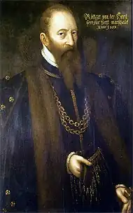 The castle's builder, also named Rütger, inherited sole possession of the Hues zor Horst on 21 May 1547.[10] He served as marshal under six Cologne electors, and Archbishop Salentin von Isenburg appointed him governor of Cologne in the Vest Recklinghausen shortly before his abdication. Rütger oversaw the construction of a new building on the site of the old castle but passed away only four years after the construction's completion in 1578. Rütger's heiress daughter, Margarethe, transferred the castle to the von Loë family of Palsterkamp und Geist through her marriage in 1582. The new castle lord, Bertram von Loë, also left no male heir. Sibylla, one of his two daughters, inherited Horst Castle, and the estate, which she brought as a dowry into her marriage to Dietrich von der Recke in 1607.[11]