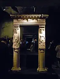 The excavations carried out on the palace grounds during the 1990s revealed a number of artifacts that revealed the artistic and historical significance of the palace. Among these discoveries were fragments of façade ornamentation and medallions featuring depictions of Roman Caesars. Notably, the excavators also unearthed pieces of what are referred to as tectonic tiles, which included high-quality moulding, cornice, wreath, and crowning tiles. The archaeological findings provided insights into the court life and table culture of the palace's former occupants. These included items such as silver and ivory cutlery, precious cut stone vessels, ceramics, and Venetian glasses.[81][82]