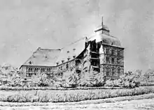 There were early signs that the building fabric was deteriorating, mainly due to the structurally unsuitable building ground in the former moat of the previous complex and the inadequate foundations of the castle building.[47] After acquiring the complex, the barons of Fürstenberg had extensive repair and renovation work carried out between 1706 and 1721, much of it due to the acute risk of collapse.[48][45] For instance, in 1711/12, a part of the courtyard façade of the manor house wing was demolished and rebuilt. The foundations were repaired in 1716, and in 1721, the northern corner tower's upper part underwent partial demolition and reconstruction.[49] Nevertheless, the complex gradually decayed despite all attempts made by the owners. The gatehouse was demolished in 1828.[45] Subsequently, the castle was repaired by Heinrich Johann Freyse, an Essen-based architect, in 1828/29. He was also tasked with remodelling the castle in the style of the time. His plans consisted of transforming the castle into a classicist-style three-winged complex. Although his plans entailed the complete removal of the Renaissance façade embellishments, the work was never completed. Just before 1830,[50] the western tower crumbled, causing damage to the northwest wing. The wing was subsequently shortened by removing the gateway entirely. It is likely that the remains of the tower were completely cleared during the work.[50][51] In the spring of 1833, the north tower collapsed and was subsequently demolished to the basement level. The south tower collapsed on Christmas Eve 1843. Around this time, the two low castle wings on the southeast and southwest sides were also demolished.[50] Before 1850,[52] the Vernukken bay window on the entrance front lost its original gable when pigeon lofts were to be housed in the wing's attic, and all the floor's window openings were closed off for this purpose.[53] During the demolition, the Fürstenberg family made efforts to preserve the valuable architectural decoration, and most of it was stored in a specially built shed until 1925. King Frederick William IV of Prussia's plans to purchase the stone decoration from Horst House during the mid-19th century resulted in 23 pictorial representations of the palace, known as the Potsdamer Blätter. These were created by the Frankfurt architectural draughtsman Karl Gustav Greiß, who had been commissioned to make an inventory. However, because negotiations conducted between 1848 and 1851 regarding the sale of the façade decorations were unsuccessful, the "Stone Treasure" remained at Horst.[12]