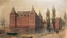 In 1567, the external construction of the first two wings of the castle was completed.[41] Previous publications suggested that the remaining, younger wings of the building had a different appearance because they were constructed under the direction of the Frenchman Joist de la Cour.[42] However, the construction diaries do not provide any evidence for this assumption, as contemporary records indicate that de la Cour had only been responsible for painting work from 1563 onwards.[43][44] The interiors featured an elaborate color scheme. During restoration work, remnants of figurative and ornamental paintings were discovered in several rooms, including a large history painting on canvas in the Knights' Hall. By 1570, the two remaining wings of the complex were also completed, and work on the interior of the palace continued until 1573.[45]