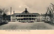 By 1902, according to a Souvenir of the City of San Antonio, the three-story Hot Wells Hotel had 80 rooms with modern conveniences including first-class furnishings, individual telephones to the main office, steam heat, electric and gas lights, and hot and cold water.[2] The octagonal bathhouse had 45 private bathrooms each with porcelain tubs, marble partitions and tile floors. Guests were segregated by sex for Roman, Russian or Turkish, steam, needle and shower baths. The water ran at 104 degrees but could be individually controlled. Three public pools (64 feet by 90 feet each) were lined with white enameled brick.[2] The Hot Wells spa was reputed to have better water quality than either the then-popular Hot Springs, Arkansas or the then-acclaimed Carlsbad, Germany spas. As elsewhere, bathing was dissuaded if suffering lung problems—it was thought the water's warmth would cause suffocation by "clos[ing] the lungs." Syphilis sufferers were made to bathe privately.[2] In addition to swimming parties, there were domino parties, concerts and lectures there during these early years. The Hot Wells Bowling Club played on nine- and ten-pin alleys.[19] There seems to have been a long tradition of Friday night dances at the Southwestern Insane Asylum where hotel guests frequently fraternized with and without patients present.[19][20]