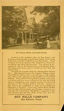 - ↑ Foodie, Honky Tonk (December 5, 2017). "Ghosts of San Antonio Past: Hot Wells Resort". Texas Hill Country magazine. Retrieved April 16, 2021.